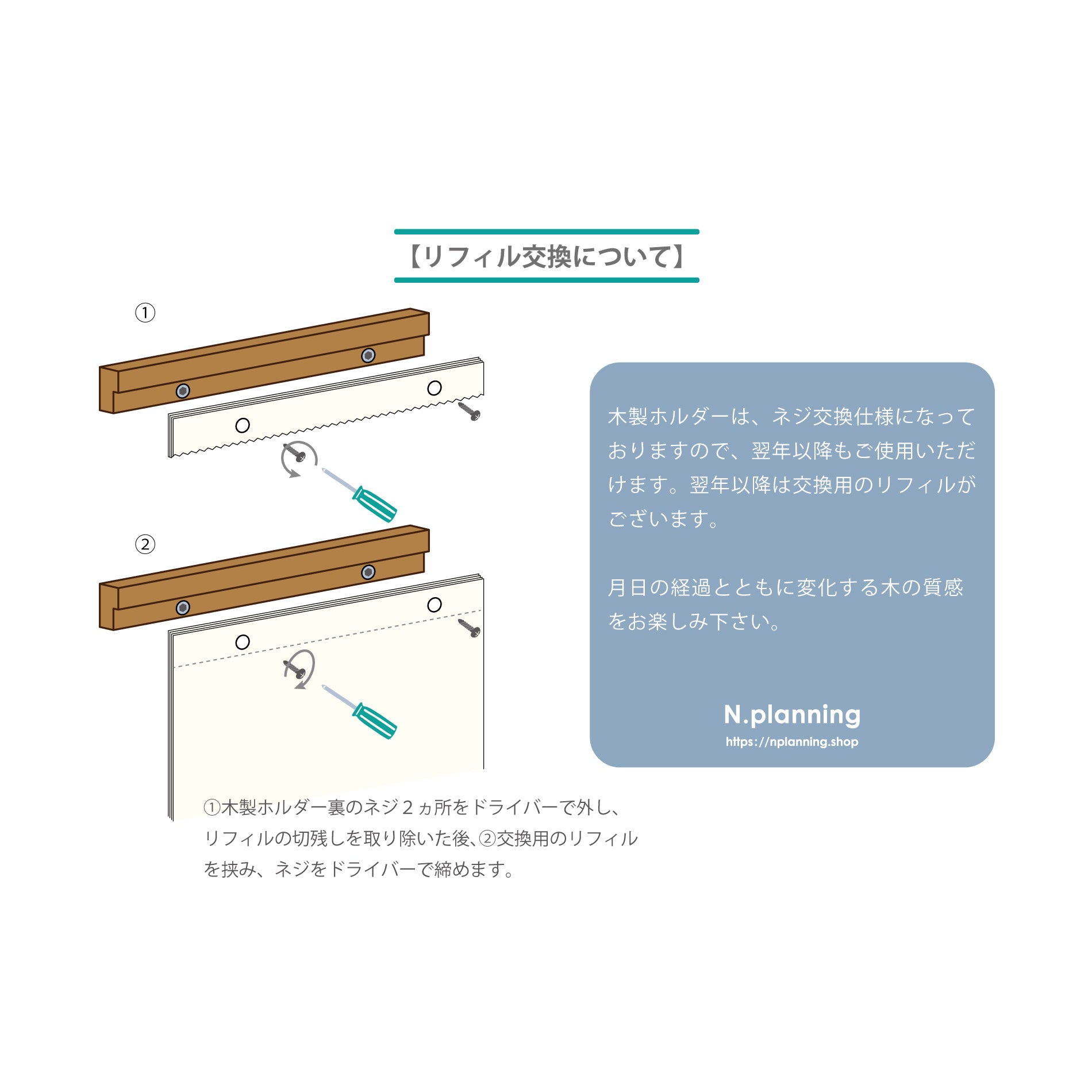 *木製ヘッダー部分を仕様変更いたしました。形状が丸面から角面となり、カレンダー用紙が取り外し交換できます。(2007年版より交換用カレンダーリフィル発売予定)